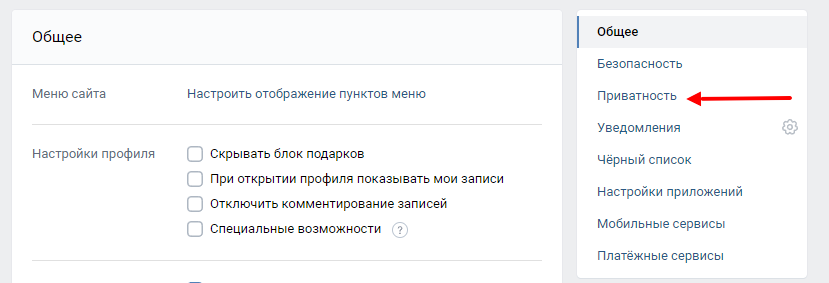 Из меню настроек нам нужна "Приватность"